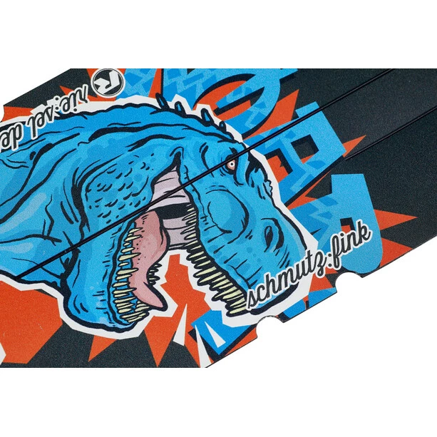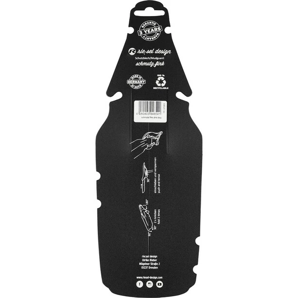 Die Form des Mudguards wurde speziell an die Anforderungen moderner Gestelle an Kindersätteln entwickelt und optimiert. Spezialfarben für die Grafiken und ein zusätzlicher Lack schützen dauerhaft vor widrigen Einflüssen. Das Design der „rit:ze L“ ist somit äußerst kratzfest. Der riesel design „schmutzfink“ wurde für den Spritzschutz im Heckbereich entwickelt. Die Montage erfolgt werkzeugfrei am Sattel zwischen den Sattelstreben.